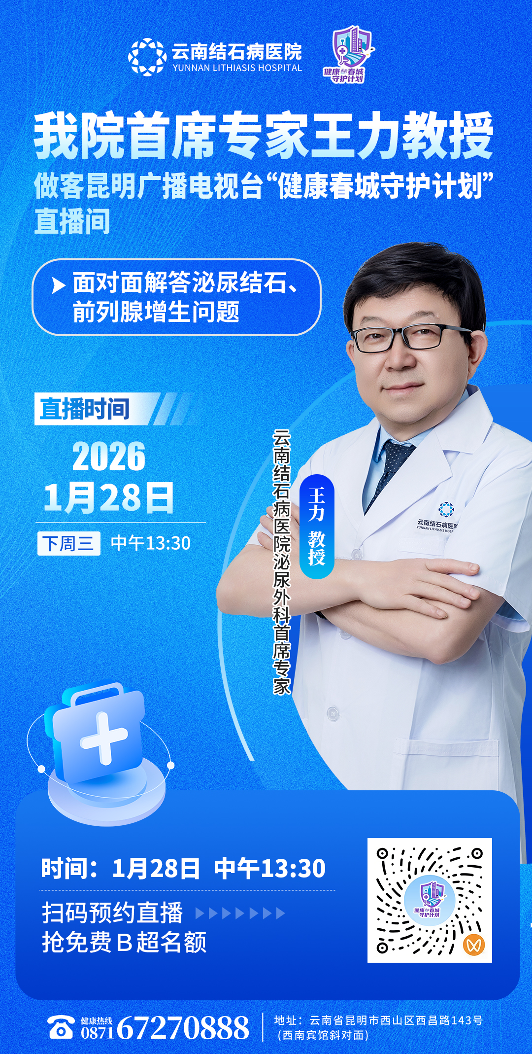 为积极响应“健康中国”战略,切实服务大众尿路通畅、肾脏健康需求,云南结石病医院联合昆明广播电视台特别策划并推出“健康春城守护计划”公益直播宣讲活动。届时,云南结石病医院首席专家【王力教授】将做客直播间,科普防“石”保“腺”全攻略,送达至每一位泌尿结石、前列腺增生患者身边。