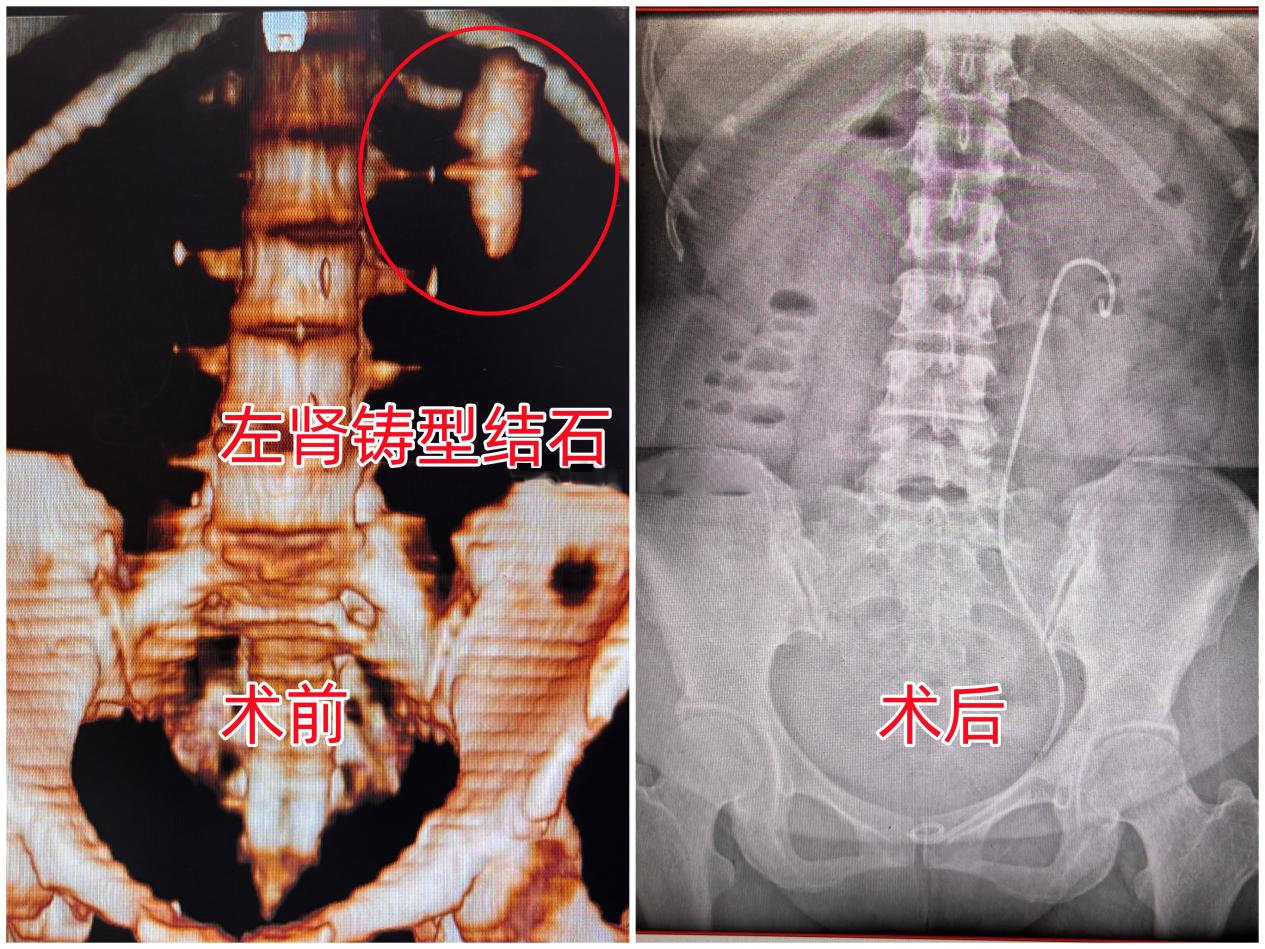 为尽快清除结石,结合肖先生的结石病情,黄鸿宾主任立即为他拟定了“经皮肾镜+输尿管软镜”联合取石的手术方案。因结石较大,考虑到手术质量和患者状态,手术分为两期施行。前日,两期手术都已顺利完成,巨型铸型结石被成功清除。